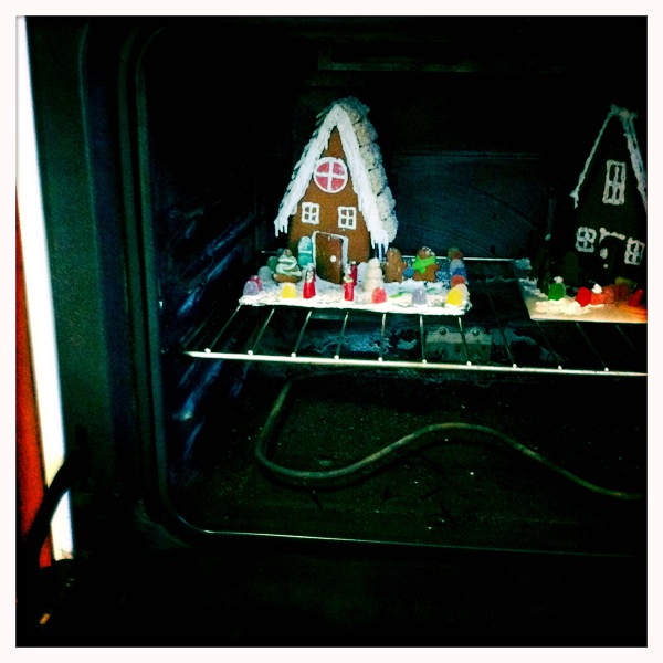 And because our house is patrolled by a hungry kitty, our houses have to spend most of the time safely hidden inside the oven. What a lovely display case.